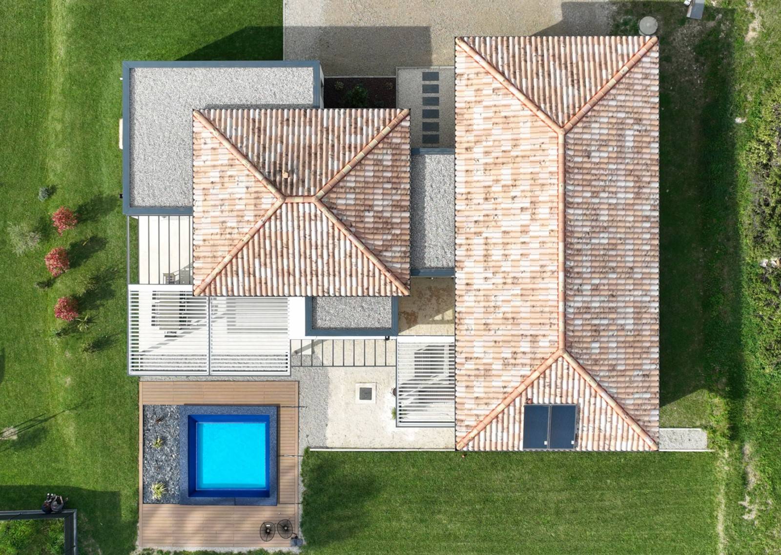 Cette intégration de plusieurs modules de pergolas bioclimatiques combiné avec le mariage de poutres et bouclier de tubes carrés en aluminium (habillage sur le dessus), permettent d’exploiter l’intégralité de la terrasse en forme de L. Conçu avec des matériaux de qualité et offrant une extension parfaite et originale à cette terrasse, notre pergola bioclimatique s'adapte à toutes les configurations, un vrai petit mécano !...