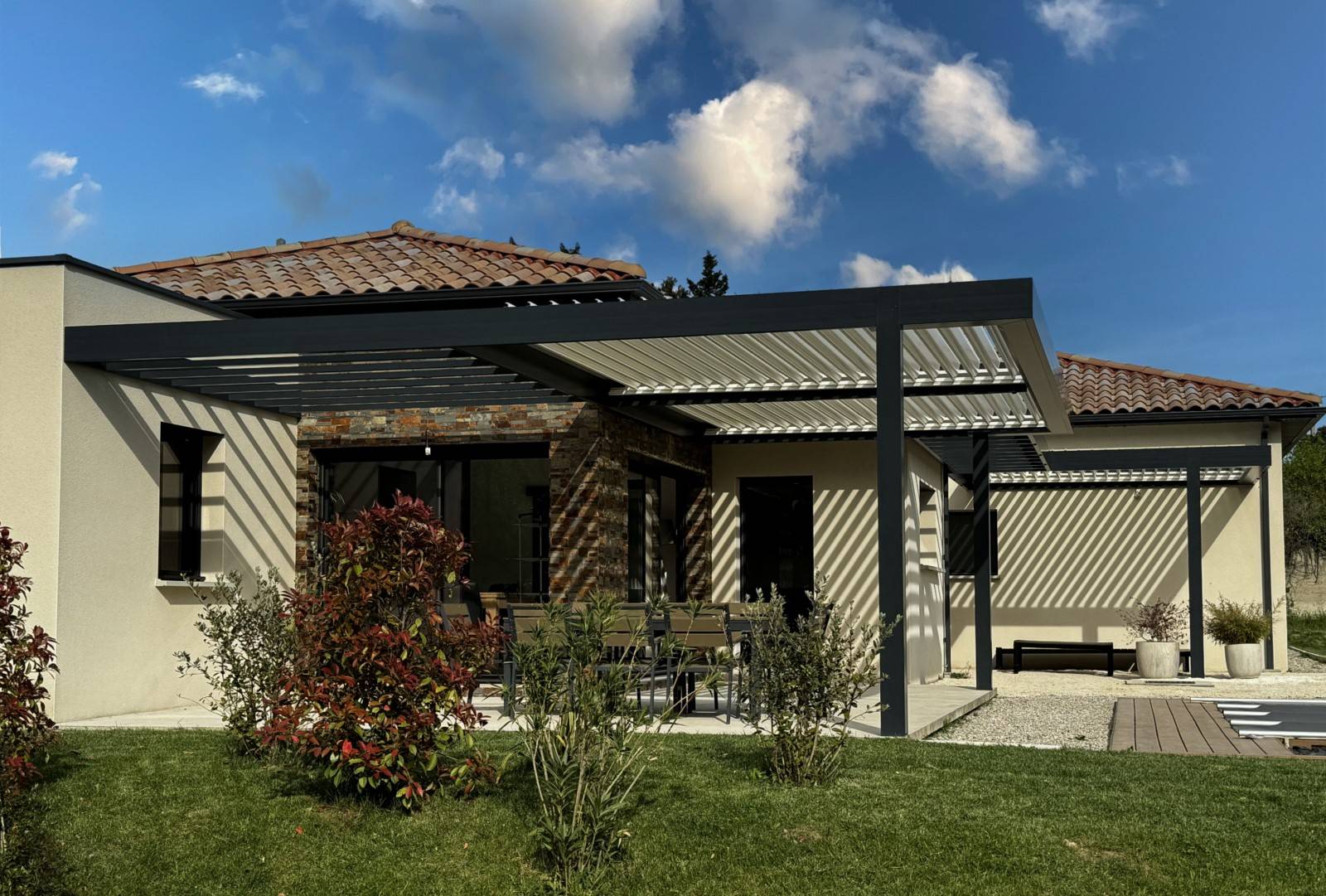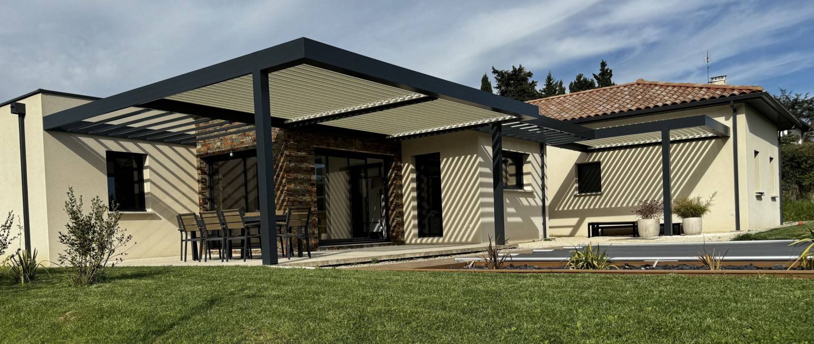 Vous rêvez d'étendre votre espace de vie en plein air avec élégance et fonctionnalité ? Découvrez notre dernière réalisation : un ensemble de pergolas bioclimatiques adossées sur mesure, implantées à Andancette, au cœur de la campagne Drômoise.