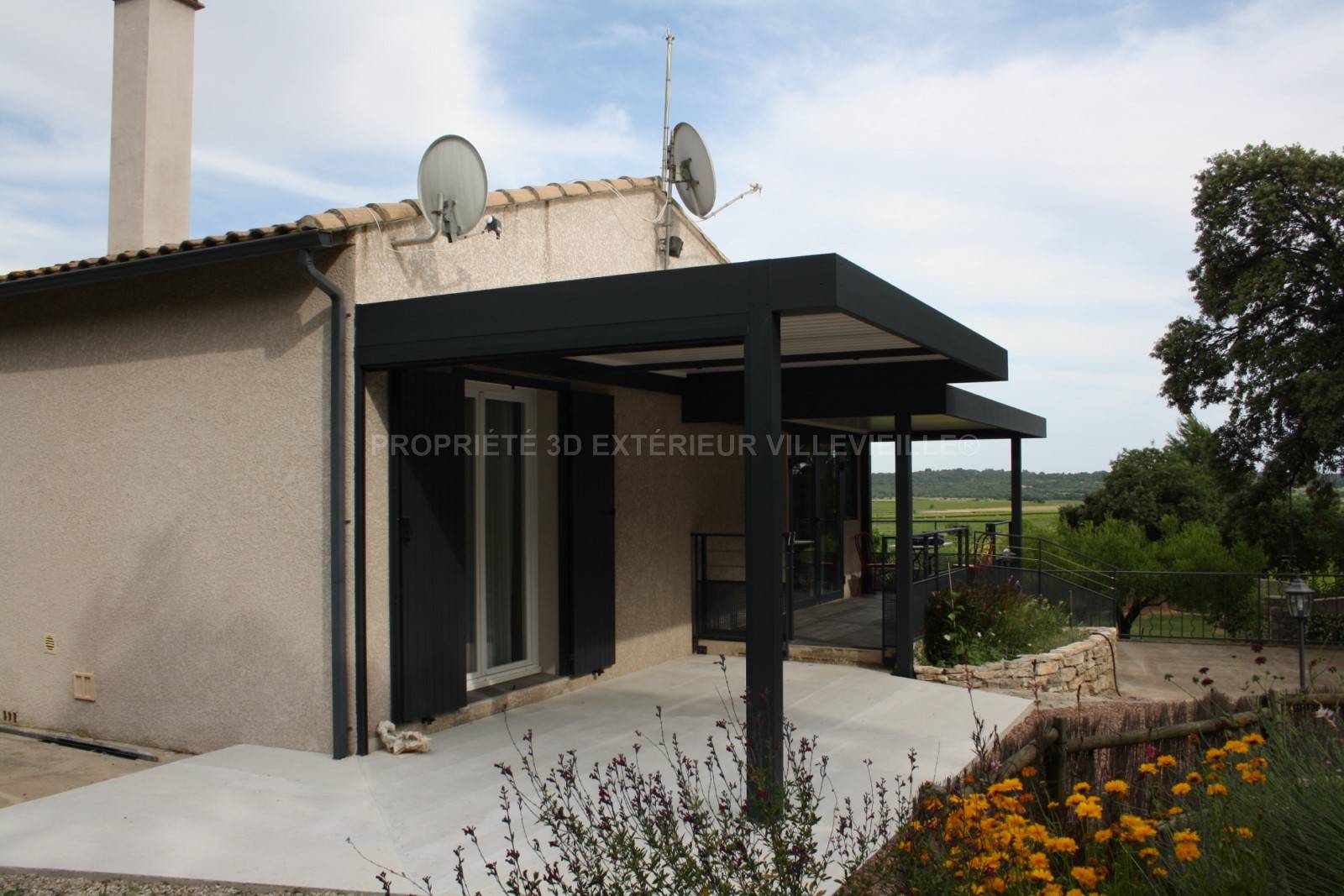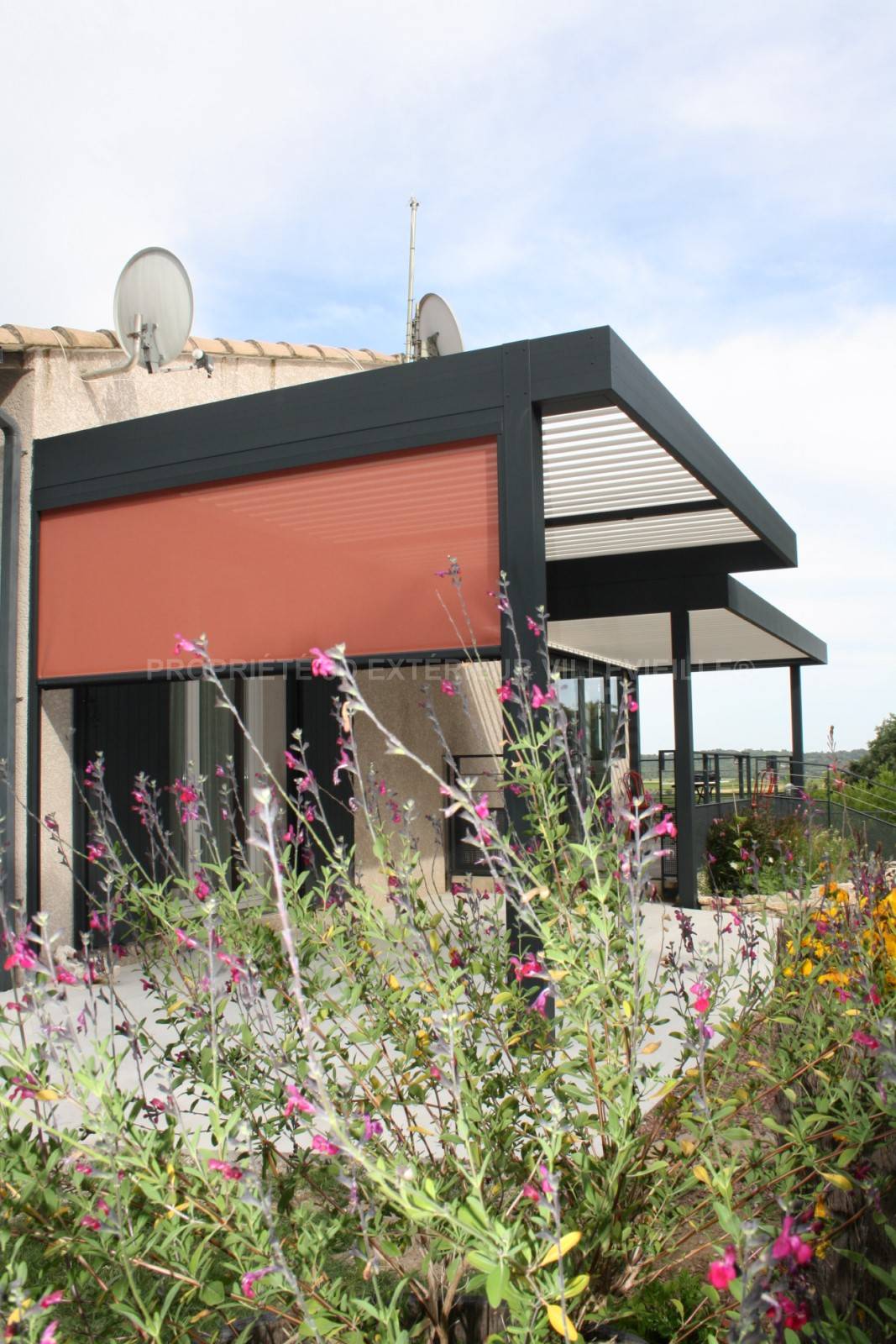 Entre Gard et Hérault, nous vous présentons cette réalisation d'une pergola bioclimatique originale avec sa structure de couleur gris anthracite, elle s’intègre parfaitement à la maison et lui donne de la modernité.