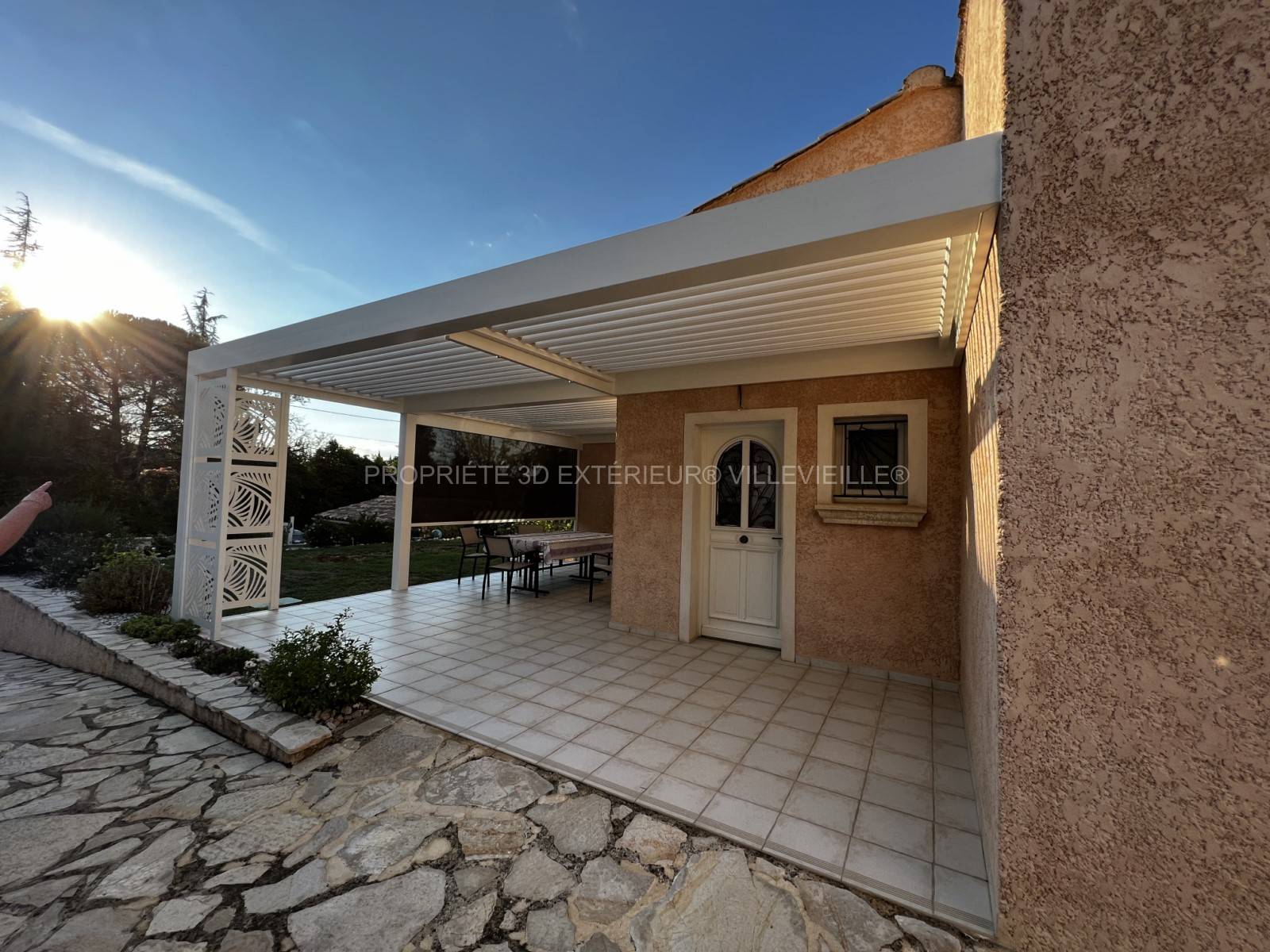 Notre entreprise spécialisée dans la conception et l'installation de structures extérieures personnalisées vous propose de découvrir la réalisation de cette pergola bioclimatique en aluminium sur mesure avec claustra décorative à Saint-Dionisy dans le Gard (30).