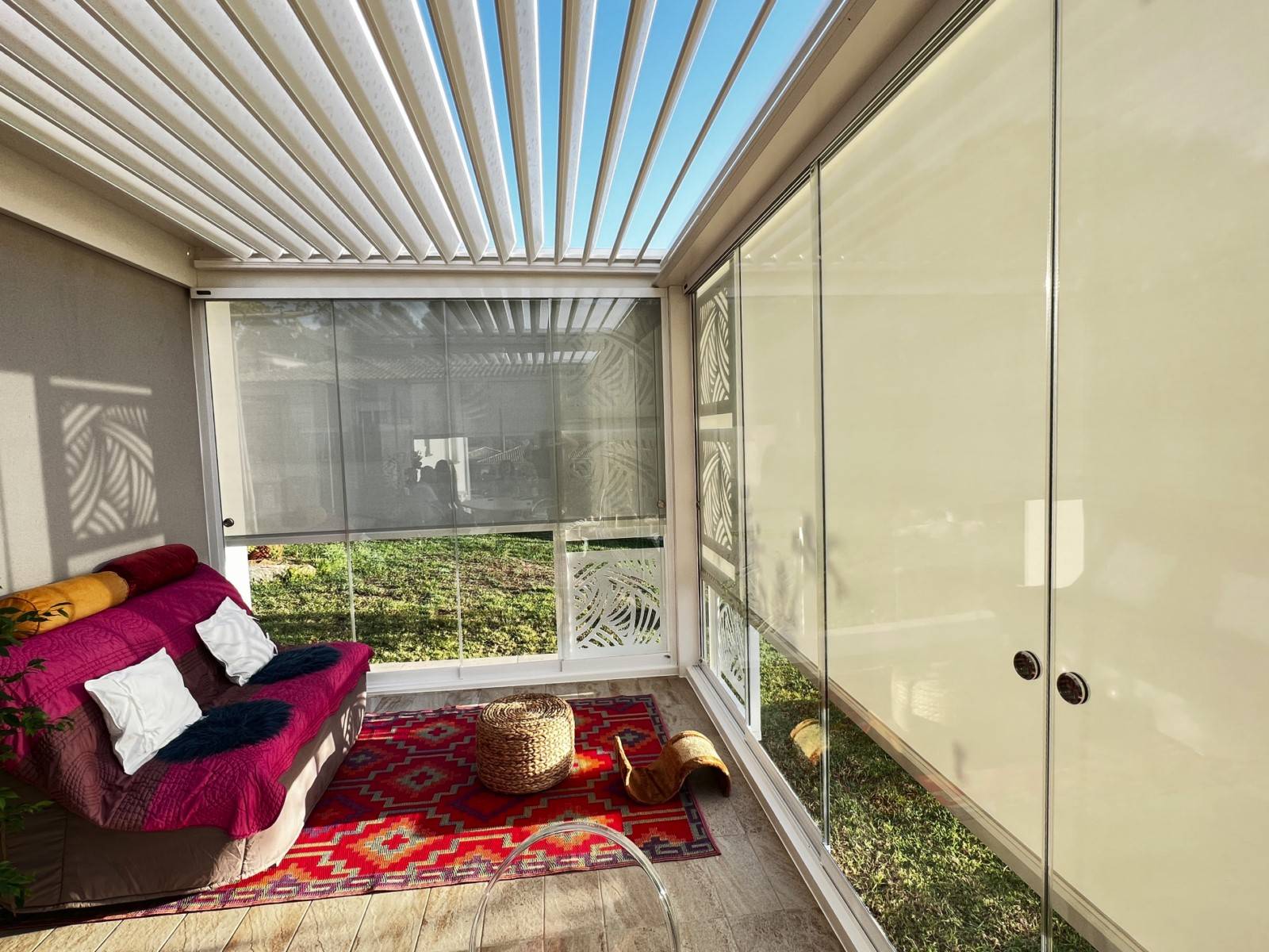 La pergola Arlequin est unique avec ses panneaux en aluminium de couleur et ses cadres coulissants qui permettent de tout fer...